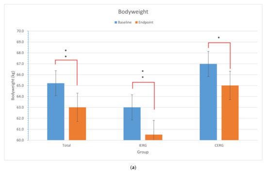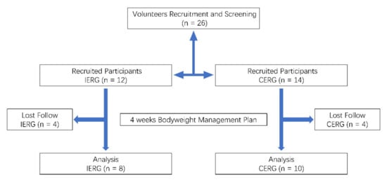 After recruitment and screening, 26 participants were included in this trial (IERG n = 12, CERG n = 14) and 18 participants completed the whole plan (IERG n = 8, CERG n = 10). The progress of the flow diagram of the whole trial is provided in Figure 2. The participants’ characteristics of each experimental group were provided in Table 1. According to the result of the Student’s t test, there is a statistically significant in age and body height between IERG and CERG. Nevertheless, there is no statistically significant difference in the baseline bodyweight, BMI, and RMR between IERG and CERG, meaning that the two groups have similar bodyweight conditions.