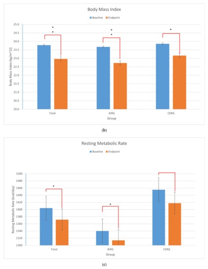 According to the results, the bodyweight and BMI have decreased and reached a statistical significance both in IERG, CERG, and total participants (p < 0.05). However, there is no statistically significant difference between IERG and CERG (p = 0.859 and p = 0.647). The RMR had a statistically significant decrease in IERG (p < 0.05) but not in CERG (p = 0.128). However, the change of RMR between IERG and CERG didn’t reach a statistically significant (p = 0.582).