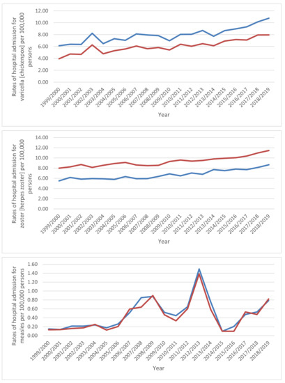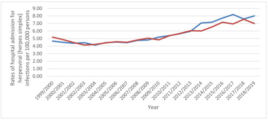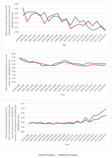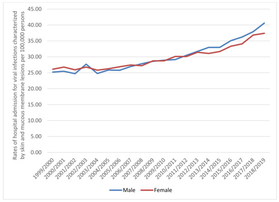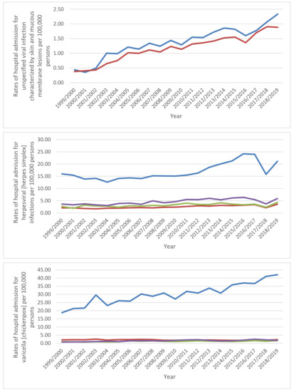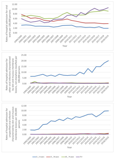 We did not have detailed information on the sub-categories reported under the ICD code B09 “Unspecified viral infection characterized by skin and mucous membrane lesions”, which might lead to the possibility of underreporting of hospital admission data. Health technologies advancement in the past 20 years is an important factor that has improved diseases diagnostic process and quality, which could have contributed to the increase in the admission rates for specific diseases (increased reporting capabilities of the healthcare system). On the other hand, during the past decade, vaccination programs have contributed markedly to the decrease in the prevalence of a wide range of diseases and decreased the severity of them and the need for hospitalisation for them. Furthermore, we used only ICD-10 codes in Chapter I (B00–B09) only. Many skin and mucous membrane legions due to viral infection might be coded in other chapters by organ system such as the ICD-10 codes K12.3 for oral ulcer, N76.5 for vaginal ulcer, or N76.6 for vulva ulcer, which are not included in our findings.