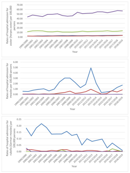 Through the past two decades, the highest increase in hospital admissions rate was seen in measles, unspecified viral infection characterized by skin and mucous membrane lesions, and other viral infections characterized by skin and mucous membrane lesions, not elsewhere classified, with increases of 4.74-fold, 4.18-fold, and 1.44-fold. Additionally, hospital admissions due to viral infections characterized by skin and mucous membrane lesions rate for varicella (chickenpox), herpesviral (herpes simplex) infections, and zoster (herpes zoster) increased by 86.6%, 52.0%, and 48.7%, respectively. However, the hospital admissions rates for rubella (German measles) and viral warts decreased by 92.4% and 24.9%, respectively (Table 2, Figure 1).