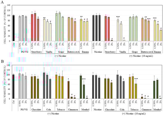 Altogether, the apparent order of cytotoxicity of nicotine-free e-liquids was cinnamon >> menthol > vanilla > banana > butterscotch > strawberry > cola = chocolate = tobacco = grape. The order of cytotoxicity in the case of nicotine-containing flavored e-liquids followed the order: cinnamon >> vanilla > menthol > banana > strawberry > tobacco > butterscotch = cola = chocolate > grape.