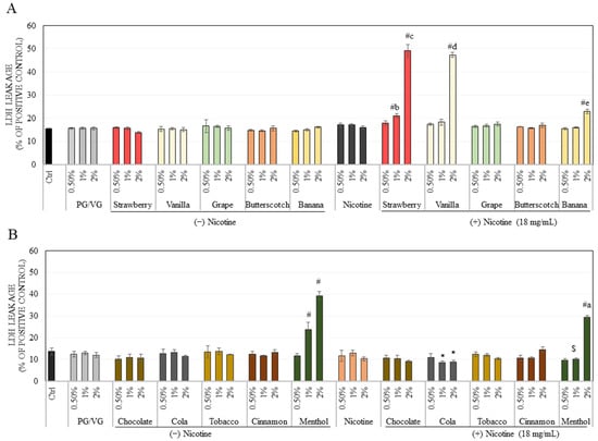 Membrane integrity of ARPE-19 cells after treatment with nicotine-free (−) and nicotine-rich (+) e-liquids of (A) Flavors: strawberry, vanilla, grape, butterscotch, banana, and (B) Flavors: chocolate, cola, tobacco, cinnamon, menthol for a duration of 48 h, as measured by LDH assay. Data are mean ± SD (n = 3 per group), One-way ANOVA with Tukey’s test. [* p < 0.05 and # p < 0.0001 vs. Ctrl; b: p < 0.0001 vs. (−) strawberry at 1%; c: p < 0.0001 vs. (−) strawberry at 2%; d: p < 0.0001 vs. (−) vanilla at 2%; e: p < 0.0001 vs. (−) banana at 2%; $ p < 0.0001 vs. (−) menthol at 1%; a: p < 0.0001 vs. (−) menthol at 2%].