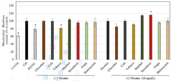 Measurement of mitochondria membrane potential in ARPE-19 cells treated with different e-liquids at a nontoxic concentration of 0.5% for a duration of 48 h. (+) Ctrl refers to the positive control in which the membrane potential has been wiped out in the presence of CCCP. Data are mean ± SD, (n = 3 per group), One-way ANOVA with Tukey’s post hoc test. * p < 0.05 and # p < 0.0001 vs. Ctrl.