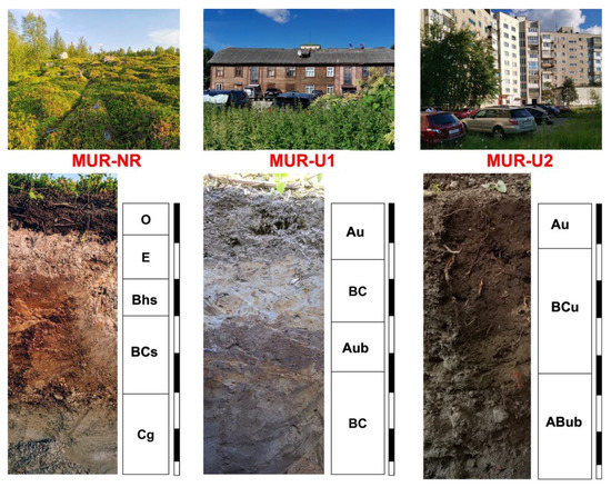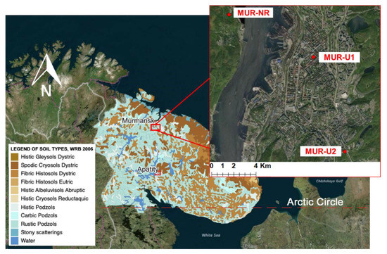 A soil survey was carried out in 2020 and included two locations in the city of Murmansk (MUR-U1 in the center and MUR-U2 in the suburb) and the third location in the natural forest-tundra area (MUR-NR), considered as a natural reference (Figure 1). At each location, a soil pit was excavated for soil description, morphological analysis, and classification according to World Reference Base [37]. Two additional points were sampled by augering, giving in total three sampling points per location. From each sampling point, the mixed samples were taken from each soil genetic horizon.