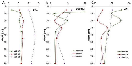 Folic Leptic Albic Podzol (Arenic) under forest-tundra had highly acidic pHH2O in the O horizon and slightly acidic pHH2O in the subsoil horizons with the maximum value in BCs. In MUR-U1 Urbic Technosol, pHH2O was on average one unit higher than in the natural soil, with the highest values in the middle part of the profile and the lowest values in the topsoil and parent material. In contrast to the first two profiles, pHH2O in MUR-U2 Urbic Technosol ranged from neutral to slightly alkaline, with the average values three units higher than in the natural conditions (Figure 3A). Profile distribution of SOC in MUR-NR had two maximums—in O and Bhs horizons, which is typical for Podzols [28,35]. Similarly, SOC distribution in the MUR-U1 profile had two maximums; however, in this case, they corresponded to the surface and buried Aur horizons. In the MUR-U2 profile, SOC stocks in the top Au and buried urbic ABub horizons were comparably high, whereas a considerably smaller amount of SOC was stored in the technogenic BCu horizon (p = 0.01399). In general, urban soils contained less SOC than the natural Podzol in the top 5–10 cm; however, the subsoil SOC contents were higher in the urban soils (Figure 3B). The profile distribution of the C/N ratio in Podzols was similar to the SOC distribution, with the highest values obtained for the O and Bhs horizons. The maximum C/N in MUR-U1 was obtained for the buried Aub horizon. A higher value compared to the surface Au horizon can be explained by a higher N input from current soil management compared to the previous urbanization stage. A slight gradual decrease of the C/N ratio was shown for the MUR-U2 profile (Figure 3C). In general, the C/N ratio in Technosols was lower than in Podzols throughout the profile, which is likely a result of additional N input, as it is often reported for urban soils in comparison to the natural references [45,46].