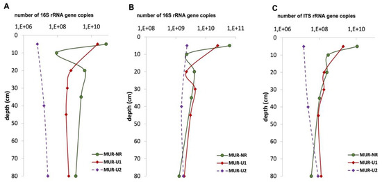 The number of ITS rRNA gene copies of fungi in natural MUR-NR topsoil (1.11 × 1010) was six times and five orders of magnitude higher than in urban MUR-U1 and MUR-U2, respectively; however, the opposite was shown for the subsoil layers deeper than 50 cm, where the number of fungi gene copies in urban soils was two-three times higher than in the natural reference (Figure 4C). The values obtained for the middle part of the profile (between 10 and 50 cm) were rather close for all three profiles, with the minimum number for MUR-U2 and negligible differences between MUR-U1 and MUR-NR soils.