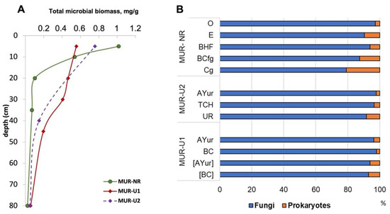 Profile distribution of the total microbial biomass (A) and fungi/ prokaryotes portion (B).