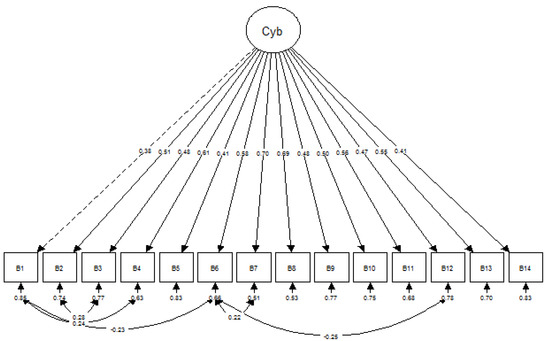 Other items with low factor loadings were B1 (0.383; “How often do you get online or text messages from another kid threatening to beat you up or hurt you physically”), B5 (0.388; “How often do you get a text or online messages that make you afraid for your safety?”), and B9 (0.307; “How often does another kid send you a message saying they will beat you up if you do not do what they want you to do?”). These items mainly pertained to receiving threats on physical damage or safety, which were considered similar. Discussion with the clinical psychologist led to the consensus that the model should retain the three items because they measured important aspects of cyberbullying among adolescents. Communalities displayed a positive range from 0.0864 to 0.5564. No items were omitted from the model. The final EFA model confirmed that the model was a one-factor model, which consisted of the abovementioned 14 items. Additionally, the CBS-M displayed positive internal consistency with high Cronbach’s alpha values although less than those of the original CBS. The coefficient value of Cronbach’s alpha for cyberbullying as a factor was 0.87, which indicates a high level of internal consistency. All items were considered important for the measurement of cyberbullying. Therefore, no items were omitted, and the study proceeded to the CFA phase.