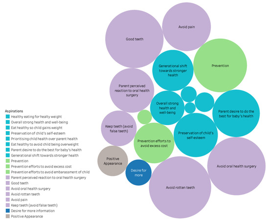 Parental aspirations contributing to intrinsic motivation. Note: The size of each bubble corresponds to the number of parents that discussed a given theme. Where more than one bubble has the same colour, the colour relates to general categories: purple with oral health, turquoise with general health, green with prevention, and grey with appearance.