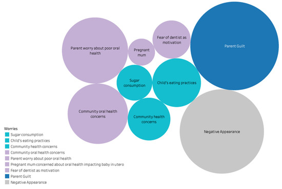 Parental worries contributing to intrinsic motivation. Note: The size of each bubble corresponds to the number of parents that discussed a given theme. Where more than one bubble has the same colour, the colour relates to general categories: purple with oral health, turquoise with general health, and grey with appearance.