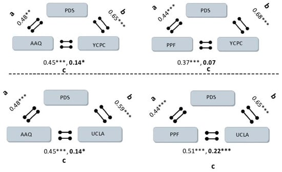 Mediation models with paths a, b, and c; * p < 0.05, ** p < 0.01, *** p < 0.001. The bold values represent the low correlations in the model.