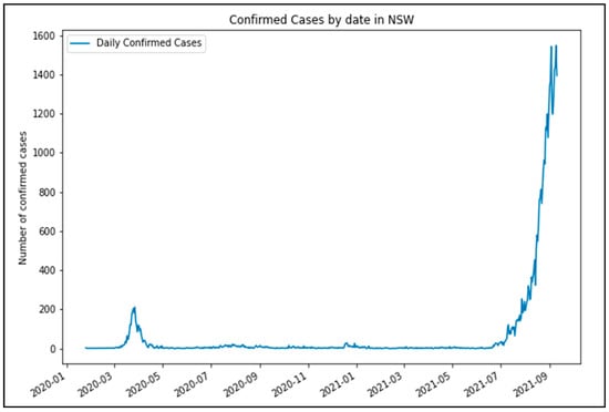 The study area for the analysis is Sydney, the capital of the state of New South Wales (NSW) in Australia. Sydney has a population of more than 5 million and is the most populous city in entire Oceania. Following outbreaks of COVID-19, the first lockdown period for NSW began on 31 March 2020. The extent of this lockdown order restricted residents of Greater Sydney from travelling except for essential purposes such as grocery shopping, work and education (if a person is unable to work or learn at their residence), compassionate grounds, or any other essential services. This order was loosened beginning on the 28 April 2020, where up to 2 visitors were allowed. On the 10 May 2020, cafés and restaurants were allowed to seat up to 10 people, and outdoor gatherings of up to 10 people were also allowed. Figure 1 highlights the onset of COVID-19 cases in NSW, which necessitated restrictions to stop the community transmission of COVID-19 [29].