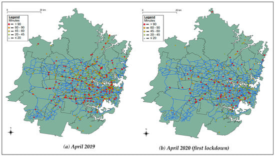 The comparison of incidents (breakdowns and crashes) in Sydney, colour-coded by duration. (a) During April 2019 and (b) during April 2020 (first lockdown).