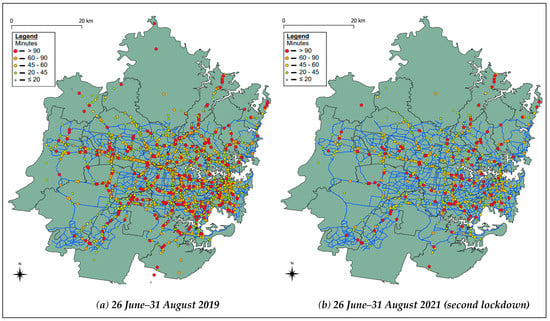 The comparison of incidents (breakdowns and crashes) in Sydney, colour-coded by duration. (a) During the period 26 June–31 August 2019 and (b) 26 June–31 August 2021 (second lockdown).