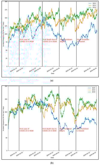 Figure 5a,b show a similar decrease in incident frequency when the second major lockdown was announced in Sydney in late June 2021. However, we see that traffic crashes decreased by more than 70% at the peak due to the stricter restrictions in place. Similarly, vehicle breakdowns dropped by 58%.