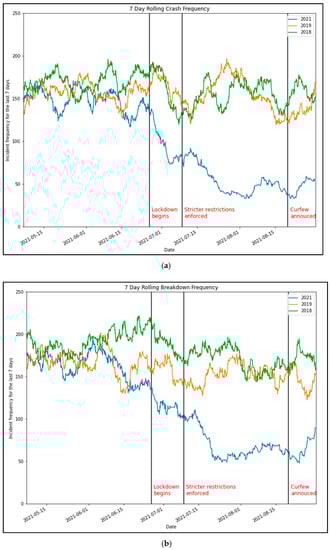 Comparison of seven-day rolling traffic incident frequency (2021 vs 2018 and 2019). (a) Crash frequency and (b) breakdown frequency.