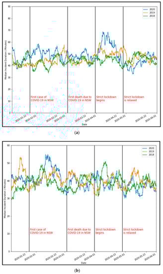 Figure 6a,b showcase the seven-day rolling mean duration for crashes and breakdowns recorded in Sydney, along with key dates for COVID-related events in NSW. It is seen that the first lockdown induced a significant change in the mean incident duration for crashes compared to the same period in previous years when there was no lockdown. However, after the lockdown orders are loosened towards the end of the April, mean incident duration can be seen at its lowest point in three years. On the other hand, no discernible trend can be seen in the breakdown duration during the first lockdown.