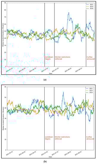Comparison of seven-day rolling mean traffic incident duration (2021 vs 2018 and 2019). (a) Crash duration and (b) breakdown duration.
