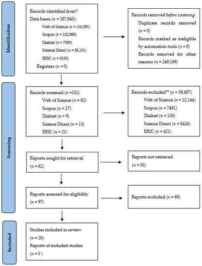 The screening and selection process was performed from February 2021 to May 2021 by two independent reviewers and supervised by a third reviewer to solve any possible discrepancy in study selection according to exclusion and inclusion criteria mentioned above. The final number of works used in the present study was 28, of which 80% (n = 20) were found in two or three databases. Only 20% (n = 5) were registered in a single database (2 in ERIC, 1 in WOS, 1 in Dialnet Plus, and 1 in Scopus). On the other hand, 85% (n = 21) of the reviewed papers were written in English, with Spanish being the language of the remaining 15% (n = 4). Figure 1 shows the search scheme for the various studies.