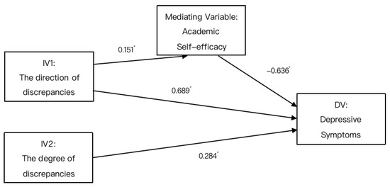 The mediating effect was tested by BK method (see Table 4) and standardized Bootstrap method. The results demonstrated that academic self-efficacy (Coeff. = −0.099, p < 0.05, CI: −0.163, −0.034) had a partial mediating function on the relationship between IV1 (the direction of discrepancies) and LBC’s depressive symptoms. No mediating effect was found between IV2 (the degree of discrepancies) and LBC’s depressive symptoms. The influencing path of the two dimensions of the differences between parents’ educational aspirations and children’s educational expectations on LBC’s depressive symptoms was shown in Figure 1.