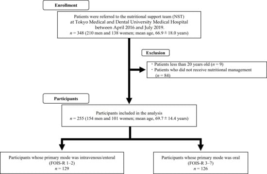 Figure 1 shows the enrollment process used in this cross-sectional study. This cross-sectional study enrolled 348 inpatients (210 males and 138 females; mean age 66.9 ± 18.0 years) referred to the NST at Tokyo Medical and Dental University Hospital for nutritional management between April 2016 and July 2019. Patients who were less than 20 years old (n = 9) and those who had not received nutritional management by NST (n = 84) were excluded from the study. Thus, this study finally included 255 consecutive inpatients aged 20 years or older (154 males and 101 females; mean age 69.7 ± 14.4 years) with no missing data. Before starting the study, informed consent was obtained by an opt-out method. We explained the details of the study and the use of the anonymized medical information to all the participants and offered them the option to refuse participation in the study by an opt-out method. This study was approved by the ethics committee of the faculty of dentistry, Tokyo Medical and Dental University (approval number: D2016-077).