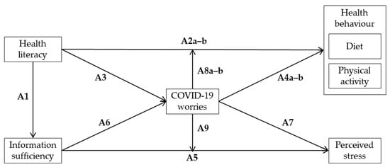 A German exploratory interview study among nursing staff in hospitals indicated that the subjective health literacy, more specifically exhibiting beneficial health behaviours, is rather limited due to specific job demands such as lack of staff and time pressure []. In the period before the COVID-19 pandemic, a German study among outpatient nurses for the elderly, almost 40% of the participants reported difficulties in dealing with health-related information (0–8 points on the 16-point HLS-EU-Q16). Thirteen percent even showed problematic health literacy (9–12 points), whereas 49% showed sufficient health literacy (13–16 points). Respondents with difficulties in handling health-related information have a 13.48-fold increased odds of having frequent thoughts of changing careers []. With regard to the COVID-19 pandemic, understanding specific health- and protection-related information has become even more important. The importance of information transmission has already been described as an important occupational health and safety measure in a recent interview study among outpatient caregivers form Germany []. However, it remains unclear how health literacy and perceived information sufficiency are related. Therefore, we explore the following assumption: