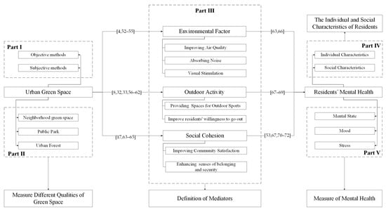 The mediators and influencing paths of urban green space’s impact on residents’ mental health [4,8,17,32,33,44,51,52,53,54,55,56,57,58,59,60,61,62,63,64,65,66,67,68,69,70,71,72]. Notes: (1) Part I and Part II are the classification and measurement of urban green space, respectively, which is defined in Section 2. (2) Part III is the mediators of urban green space’s impact on residents’ mental health, which is the core part of the article. This part will be shown in Section 3.1. (3) Part IV is the heterogeneity characteristics of residents. The heterogenous effect of different mediators on various groups is shown in Section 3.2. (4) Part V is the measurement of mental health, which is presented in Appendix A. (5) Based on part III, the classification and definition of mediators is discussed in Section 4.1. (6) Based on part IV, the individual and group characteristics of residents are discussed in Section 4.2. (7) Based on parts I and II, the classification study and quality analysis of green space will be discussed in Section 4.3. (8) Based on parts III and V, measures of mental health are discussed in Section 4.4 in terms of mediator.
