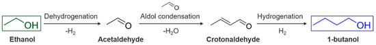 As is well known, a large volume of ethanol made from renewable carbon-neutral resources (i.e., biomass), called bioethanol, is being employed not only as a biofuel additive for gasoline [17,18] but also as a feedstock of various chemicals [19,20,21,22]. Approximately 98.4 billion liters of bioethanol was produced in 2018 [23]; however, its water solubility, corrosivity, and the differences in fuel properties between bioethanol and conventional transportation fuels (e.g., gasoline) make it unsuitable to employ ethanol fuel in modern internal combustion engines [24]. Hence, the use of ethanol as the feedstock for the production of butanol has great potential. The process that converts ethanol to n-butanol is industrialized, which increases the carbon number by coupling two ethanol molecules. The Guerbet reaction is an aldol-condensation-type reaction of coupling alcohols, involving oxidation of alcohol to aldehyde, aldol condensation of the aldehyde to allyl aldehyde, and hydrogenation of the allyl aldehyde to its corresponding alcohol [25]. For the reaction from ethanol to n-butanol, dehydrogenation of ethanol occurs first to make acetaldehyde [26]. Aldol condensation of acetaldehyde to crotonaldehyde then takes place, followed by hydrogenation to form n-butanol [27]. The conversion of ethanol to n-butanol is described in Figure 1.