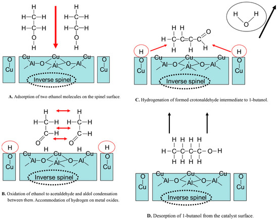 Other than the aforementioned solid acid–base catalysts, the butanol production from ethanol over metal catalysts has been reported. Riittonen et al. screened a variety of supported metal catalysts (Pt, Ru, Rh, Ag, Au, and Ni) to find active catalysts for the direct conversion of ethanol to n-butanol [55]. The selectivity towards n-butanol followed an order of Ni > Pt > Rh~Au > Ru >> Ag. It was found that an Al2O3-supported Ni catalysts with a Ni loading of 20.7% was the most selective catalyst for the n-butanol production via dimerization of ethanol (80% selectivity at 25% ethanol conversion at 250 °C). A process that continuously converts ethanol to n-butanol using Ni/γ-Al2O3 catalyst was developed by Ghaziaskar and Xu [56]. The reaction was carried out in a continuous-flow packed-bed reactor at a range of temperature between 135 °C and 300 °C at a weight hourly space velocity (WHSV) between 6.4 h−1 and 15.6 h−1. The highest selectivity toward n-butanol (62% at 35% ethanol conversion) was achieved with an 8% Ni/γ-Al2O3 catalyst (stable for 18-h time-on-stream) at 250 °C under 17.6 MPa. Dowson et al. used Ru-based homogeneous catalysts to transform ethanol to n-butanol [57]. A 94% n-butanol selectivity at >20% ethanol conversion was obtained. It was suggested that the homogeneous catalytic system tamed uncontrolled base-catalyzed aldol condensation of acetaldehyde. Figure 2 shows a schematic of a mechanism of ethanol conversion to n-butanol over alumina-supported metal catalysts [58]. It consists of adsorption of two ethanol molecules on the spinel surface (Figure 2A), oxidation of ethanol to acetaldehyde and aldol condensation between these compounds with the accommodation of hydrogen on metal oxide (Figure 2B), hydrogenation of crotonaldehyde to n-butanol (Figure 2C), and desorption of n-butanol from the catalyst surface (Figure 2D).