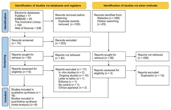 Seventeen articles were eliminated due to the following causes: ten studies were still ongoing [,,,,,,,,,], two studies were in vitro [,], two studies were critical appraisals [,], one paper was a letter to the editor [], one was an editorial paper [], and one study had no control group []. Therefore, 16 studies were involved in the systematic review [,,,,,,,,,,,,,,,]. Seven of the sixteen studies documented their results as percentages, which were excluded from the meta-analysis [,,,,,,]. Nine studies involving 878 participants were included in the meta-analysis [,,,,,,,,]. The main features of the sixteen included articles are summarized in Table 1.