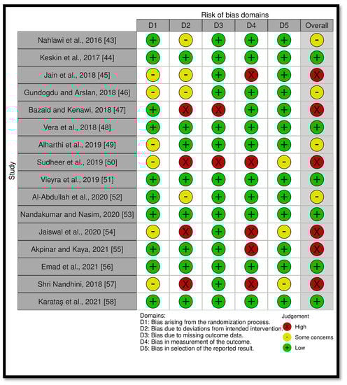 Eight of the sixteen articles consisted of two parallel groups [,,,,,,,], four studies had three parallel groups [,,,], three studies had four parallel groups [,,], and one study had five parallel groups []. The number of participants in these studies ranged from 30 to 240 with ages ranging from 18 to 70 years diagnosed with irreversible pulpitis in 11 studies [,,,,,,,,,,], necrotic pulp in 3 studies [,,], and pulpal and periradicular pathosis or normal periradicular tissues in 12 studies [,,,,,,,,,,,]. The assessment of postoperative pain ranged from day 1 to day 7 and it was measured using a visual analogue scale (VAS, 0–10 cm) in 12 studies [,,,,,,,,,,,]. Three studies used the VAS (0–100) [,,], one study used the Heft–Parker scale [], and all of the scales were converted into a 0–10 cm VAS for statistical calculation standardization. Preoperative pain was evaluated in 13 studies [,,,,,,,,,,,,] ranging from no pain in 2 studies [,] to mild pain in 2 studies [,], moderate pain in 2 studies [,], and severe pain in 6 studies [,,,,,]. One study had fourteen patients with mild pain, twelve patients with moderate pain and fourteen patients with severe pain []. Three studies did not clearly describe the preoperative pain assessment [,,]. The final cold irrigant used was either saline in most of the studies [,,,,,,,,,,,] or sodium hypochlorite (NaOCl) [,,,]. The temperature of the final irrigant ranged from 1.5 °C to 4 °C and the volume was 5 mL [,,], 10 mL [,,], or 20 mL [,,,,,,,] for durations of 1 min [,,], 2 min [], or 5 min [,,,,,,,,,]. Two studies did not mention the duration [,]. EndoVac negative irrigation was used along with needle syringe activation in five studies [,,,,]. Thirteen studies (n = 1219) compared the intracanal cryotherapy and control groups in terms of using analgesics postoperatively [,,,,,,,,,,,,]. None of the patients in either group used analgesics in four studies [,,,] and fewer patients used analgesics in the intracanal cryotherapy group in eight studies [,,,,,,,]. The same number of patients in both groups used analgesics in one study []. Three studies did not mention any information about the use of analgesics postoperatively in either group [,,]. Nine studies mentioned that root canal treatment was completed in one visit [,,,,,,,,], six studies performed root canal treatment in two visits [,,,,,], and one study did not mention any information about the number of root canal treatment visits [].The risk of bias (RoB 2) assessment for the included studies is summarized in Figure 2. According to the RoB 2 [] assessment for the included sixteen studies, four studies were considered to have a high bias due to “deviations from the intended intervention” [,,,], two studies were considered to have a high bias due to “missing outcome data” [,], and five studies were considered to have a high bias for “measurement of the outcome” [,,,,].