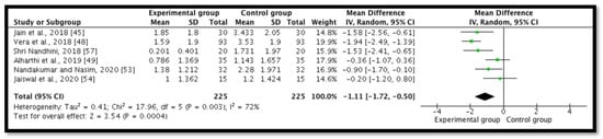 Six studies (n = 450) revealed postoperative pain at 6 h [,,,,,]. A meta-analysis demonstrated a significant statistical diminution in postoperative pain in the intracanal cold therapy group (experimental group) compared with the room temperature irrigant group (control group) (mean difference (MD) = −1.11; 95% confidence interval (CI) = −1.72 to −0.5; p = 0.0004; I2 = 72%) (Figure 3). The GRADE was low because of concerns with the RoB 2 and the substantial heterogeneity, which indicated that “we have little confidence in the effect estimate and the true effect might be markedly different from the estimated effect” (Table 2).