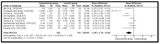 Nine studies (n = 763) revealed postoperative pain at 24 h [,,,,,,,,]. A meta-analysis demonstrated a significant statistical diminution in postoperative pain in the intracanal cold therapy group (experimental group) compared with the room temperature irrigant group (control group) (MD = −1.08; 95% CI = −1.79 to −0.38; p = 0.003; I2 = 92%) (Figure 4). The GRADE was low because of concerns with the RoB 2 and the substantial heterogeneity, which indicated that “we have little confidence in the effect estimate and the true effect might be markedly different from the estimated effect” (Table 2).