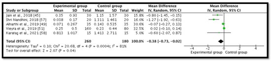 Five studies (n = 440) revealed postoperative pain at 48 h [,,,,]. A meta-analysis demonstrated a significant statistical diminution in postoperative pain in the intracanal cold therapy group (experimental group) compared with the room temperature irrigant group (control group) (MD = −0.38; 95% CI = −0.73 to −0.02; p = 0.04; I2 = 81%) (Figure 5). The GRADE was low because of concerns with the RoB 2 and the substantial heterogeneity, which indicated that “we have little confidence in the effect estimate and the true effect might be markedly different from the estimated effect” (Table 2).