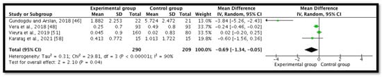 Three studies (n = 113) revealed postoperative pain at seven days [,,]. Two of these studies [,] had zero scores for the mean and standard deviation for the experimental group. Therefore, the MD and CI were not estimable.