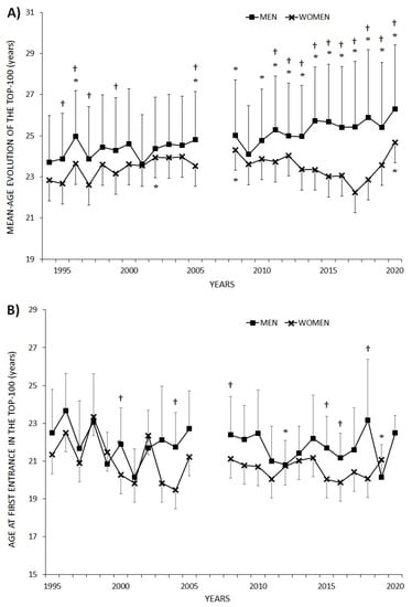 Evolution of average age in badminton players (both men and women) present in the World Ranking top 100 from 1994 to 2020 (A). Evolution of the average age of badminton players’ on their first entry in the World Ranking top 100 from 1995 to 2020 (B). * Significant differences in regard to the first record of the series in 1994 (p < 0.05); † Differences between men and women in paired data (p < 0.05).
