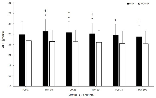 Average age of badminton players in reaching their peak performance considering their best career ranking in the World Ranking. * Significant differences in regard to the top 100 (p < 0.05); † significant differences in regard to women players (p < 0.05).