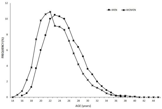 Frequency distribution in relation to age in badminton players (both men and women) with 1-year intervals in the analysed period (1994–2020).