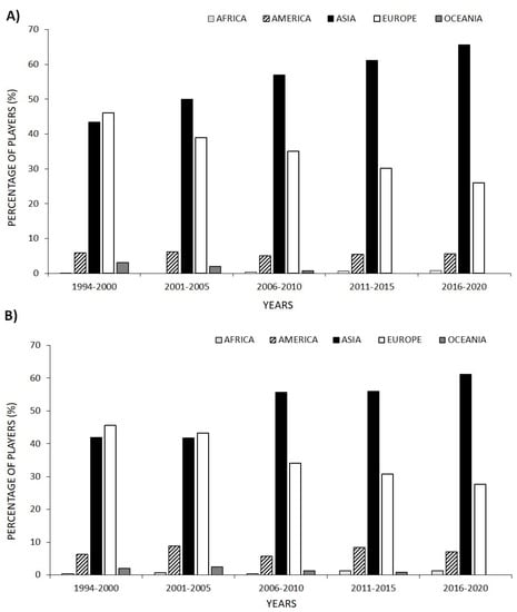 Regarding the number of players per continent in the WR top 100, both men and women from Asia and Europe showed a similar percentage in the first years (1994–2000) with ~46% and ~43%, respectively. However, from 2006 onwards, the presence of Asian players became more significant, surpassing 50%, followed by European players with ~30% and with fewer than 10% American players. Africa and Oceania were almost totally unrepresented, and even absent in some years. More than 60% of the players were Asian in the 2016–2020 period. (Figure 4).