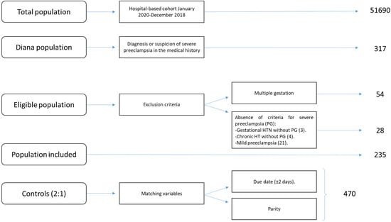 Figure 1 presents the flowchart of the patients according to the inclusion and exclusion criteria; finally, 235 cases and 470 controls (705 patients total) were obtained from this hospital-based cohort. It should be noted that 73.2% of the consultations between the obstetrics and nephrology services were for SP, and that 21 patients with this initial diagnosis did not meet the current criteria for severity, which have changed over time, and were therefore discarded from the study.