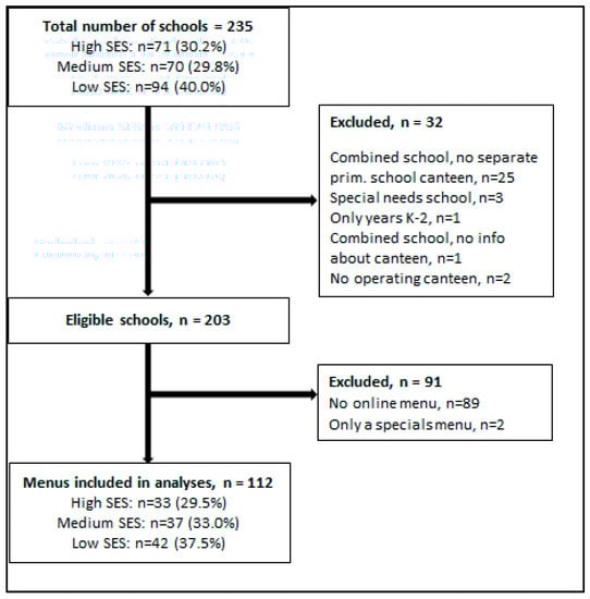Canteen menus available online were downloaded from Sydney-based primary schools’ websites between July and November 2018. A stratified approach for school selection was followed. The Index of Relative Socio-Economic Advantage and Disadvantage scores (IRSEAD) were obtained from the Statistical Local Areas (SLAs) of Greater Sydney []. A tertile split was conducted to divide SLAs into low (IRSEAD deciles 1–5), medium (IRSEAD deciles 6–8) and high (IRSEAD 9–10) SES. Four SLAs were randomly selected per SES category using Excel’s random number generator function. Google Maps was used to identify all primary schools within each SLA, which were screened against eligibility criteria using the ‘My School’ website (www.myschool.edu.au): primary school with Kindergarten to Year 6 (K-6), or a combined primary and secondary school (K-12) if a separate primary school canteen menu was available. Schools were excluded if they were exclusively Special Learning Needs Schools or did not have a separate primary school menu.