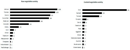 More items contained raw (16.9 ± 10.3 items) than cooked vegetables (8.7 ± 6.8 items, p < 0.01) and variety was larger for raw (4.9 ± 1.8) than for cooked (1.3 ± 1.2; p < 0.01) vegetables. Across all menus, 14 raw and 13 cooked vegetables were mentioned (Figure 3). Raw vegetables were mostly lettuce, cucumber, tomato and beetroot, and used in salads and sandwiches. Celery, carrot and cucumber were also often listed as snacks (with or without dips). Corn on the cob was the most listed cooked vegetable, followed by spinach and tomato. Other cooked vegetables were very infrequently mentioned.