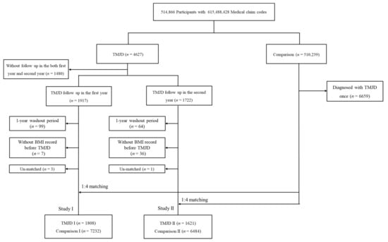 A schematic illustration of the participant selection process that was used in the present study. Of a total of 514,866 participants, 4627 TMJD participants were selected. Among them, we excluded participants without histories of first- or second-year follow-up records (n = 1480). Then, participants were categorized as TMJD I with a first year of follow-up (n = 1917) and TMJD II with a second year of follow-up (1722). A total of 492 TMJD participants were included in both groups. After the exclusion of 1 year of wash out, participants without BMI records, and unmatched participants, TMJD participants were 1:4 matched with comparison participants.