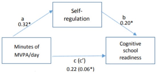In addition, further research is needed to explore the pathways through which physical activity influences preschool children’s cognitive development. Given that self-regulation skills underlie many of the attributes and behaviours associated with cognitive school readiness, and there is some evidence to show that higher self-regulation is associated with better school readiness outcomes [15,19], as well as some evidence that physical activity is associated with both self-regulation [17] and cognitive development [18], it is possible that self-regulation mediates the relationship between physical activity and cognitive school readiness. A recent systematic review on preschool children’s physical activity, school readiness, and cognition showed that there is still not a clear consensus of the evidence regarding the association between physical activity and preschool children’s cognitive outcomes [7]. The review reported mixed findings and called for more research to understand the mechanistic pathways between physical activity, self-regulation, and cognitive outcomes in preschool children.