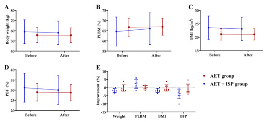 The changes in (A) body weight, (B) PLBM, (C) BMI, and (D) PBF for the AET and AET + ISP groups before and after intervention; (E) the improvement in body composition of the two groups, shown as a percentage, means the reductions in value for body weight, BMI and PBF, as well as the gain in value for PLBM.
