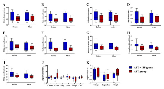Changes in various body sites, as indicated, for the AET and AET + ISP groups before and after 8 weeks of intervention: (A–F) circumference changes (cm); (G–I) thickness of skinfold changes (mm); (J) improvements in the circumference (%); (K) improvements in the thickness of skinfold (%). The improvement in anthropometric characteristics means the reductions in value for circumference and thickness of skinfold.