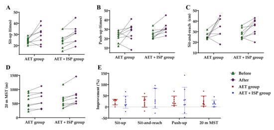 (A–D) The changes in physical fitness for the AET and AET + ISP groups before and after 8 weeks of intervention using various tests, as indicated; (E) the percent improvements of the two groups in the physical fitness means the percent gains in value for each test.