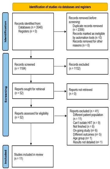 The 11 reviewed studies [3,33,35,42,43,44,45,46,47,48,49] utilized various forms of HIIT that varied in modality, intensity, work-to-rest ratio, intervention duration, intervention frequency, and total number of interventions, as presented in Table 2.