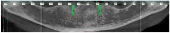 The development of specific software in clinical guided implant dentistry provides a virtual method to treatment planning of flapless implant surgery in rehabilitation of totally and partially edentulous patients [,]. The accuracy of positioning of the implants in alveolar ridges must be considered an important factor in clinical situations with limited bone volume. In geriatric edentulous patients, the loss of mandibular teeth induces many anatomical changes, particularly regarding its shape, volume, and density. The diagnosis of these bone characteristics by CBCT allows a clinician to select the best implant surgery to achieve good primary stability and fast osseointegration [,].