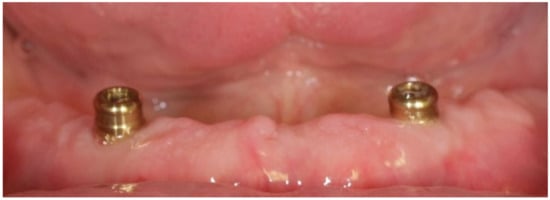 - Bidra, A.S. Flapless implant surgery to overcome anatomic challenges in the anterior mandible for overdenture therapy: A clinical report. J. Prosthet. Dent. 2014, 111, 175–180. [Google Scholar] [CrossRef] [PubMed]